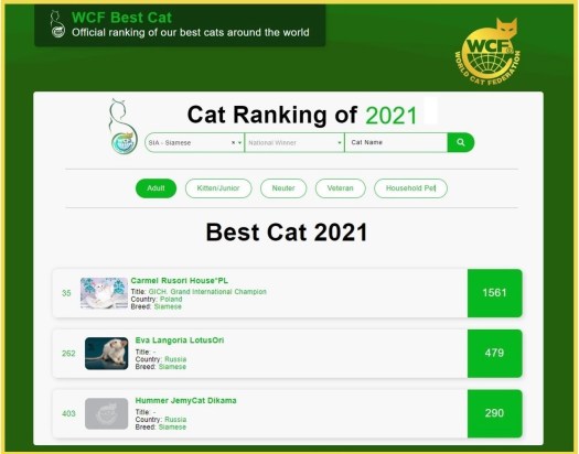 Nasz RUSORI HOUSE *PL CARMEL w oficjalnym rankingu kotów rasowych WCF BEST CAT zajął 1. miejsce zostając NAJLEPSZYM KOTEM SYJAMSKIM NA ŚWIECIE.